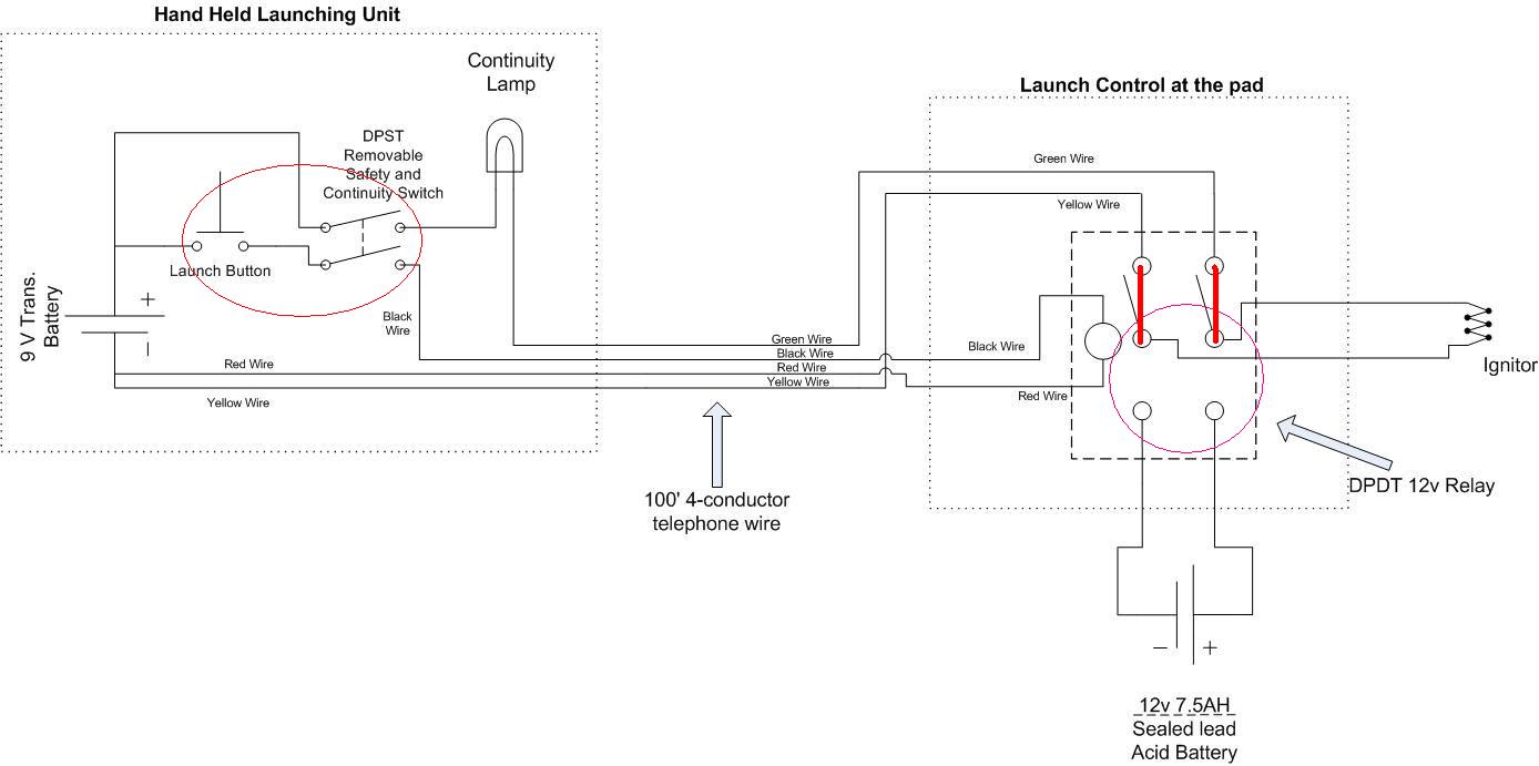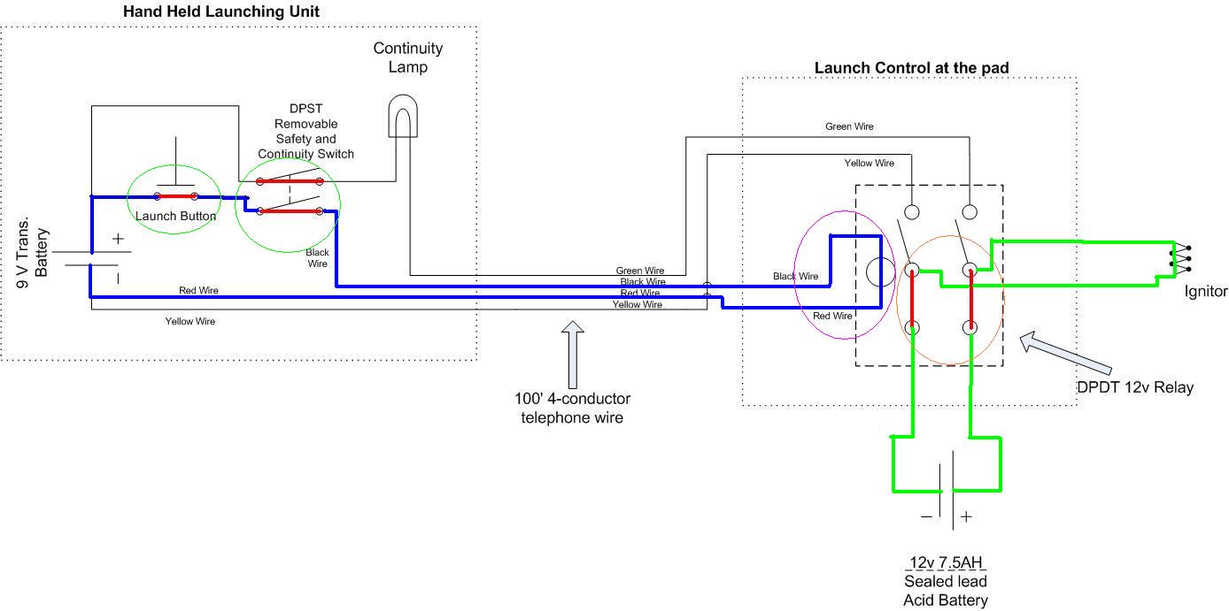 This design of a relay launch controller uses a small 9-volt battery in the hand unit for continuity and to trigger the switch on the relay for launch.